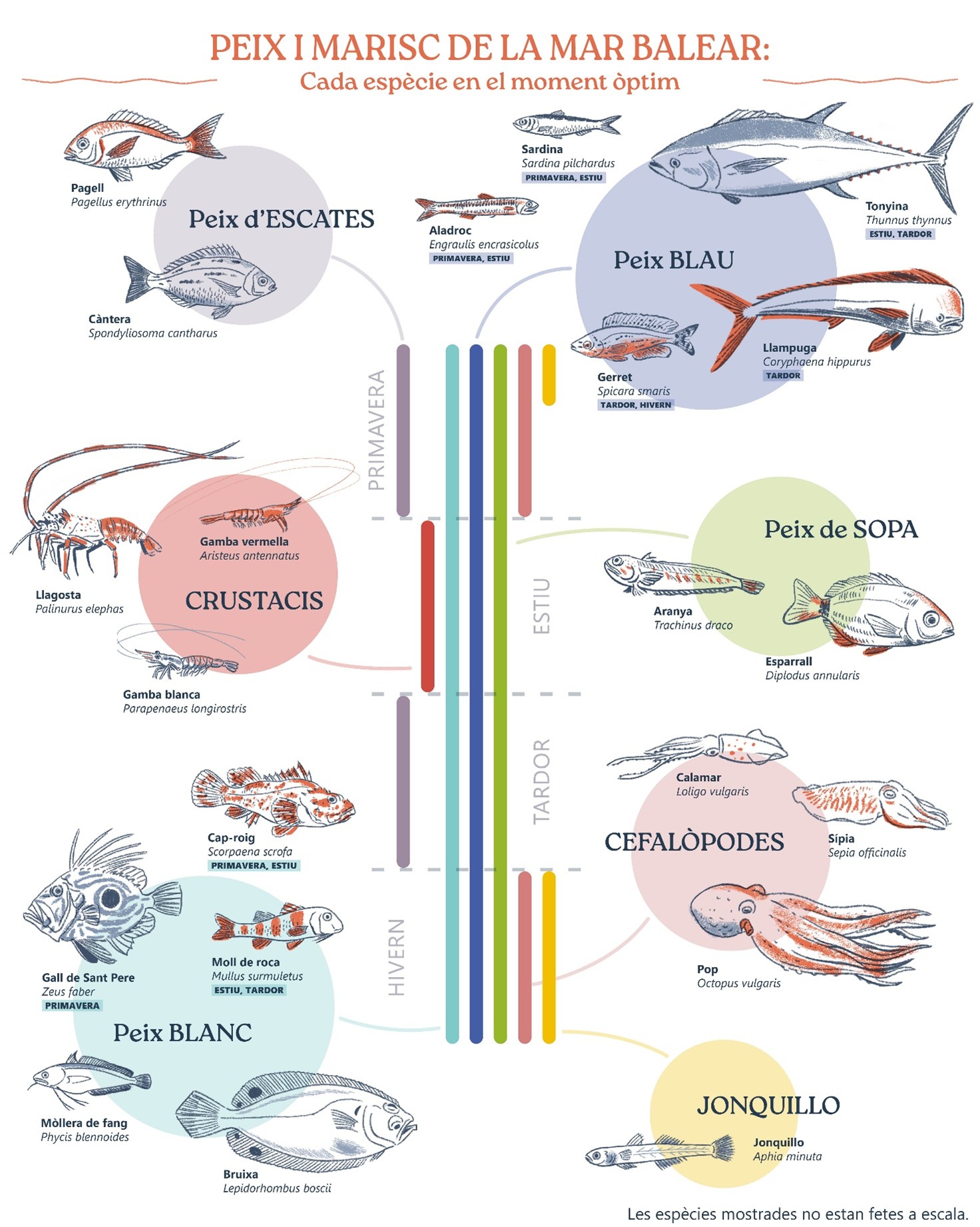 A partir del calendari de peix i marisc de la mar Balear, aquesta activitat ens convida a reflexionar sobre la sostenibilitat, la proximitat i el consum responsable dels recursos marins. Mitjançant dinàmiques participatives i materials visuals, l’alumnat descobrirà quines espècies es poden consumir segons l’època de l’any i aprendrà a identificar arts de pesca selectives i respectuoses amb el medi marí.